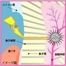 歯の表面では「エナメル質」によって象牙質は守られていますが、そのエナメル質が削れてしまったり、また歯ぐきの退縮などにより歯根部が露出することで象牙質があらわになると、何らかの刺激が直接象牙質へ伝わるようになってしまいます。