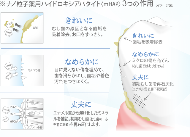 3つの作用でエナメル質を整えて、むし歯を予防します。